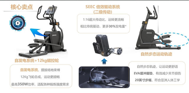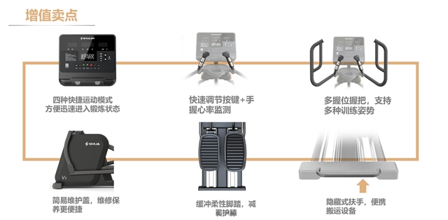 安全稳重,细节制胜。bsports官网V8椭圆机是一款高安全系数的椭圆机,整体设计遵循人体工学科学,缓震踏板中添加减震层设计,能够有效减少运动冲击带来的关节损伤,且最大支持160kg载重,满足更多人群。手握心率监测、多功能置物架、自发电系统取代统电源......在细节上,新款椭圆机站在健身者角度,添加了不少设计者的巧思,为健身者带来更贴心的体验。