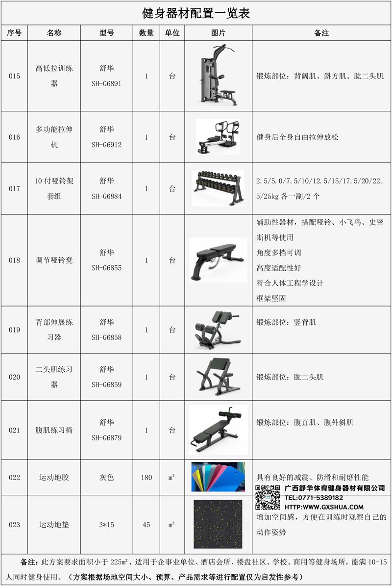 此方案要求面积小于225m²,适用于企事业单位、酒店会所、楼盘社区、学校、商用等健身场所,能满10-15人同时健身使用(方案根据场地空间大小、预算、产品需求等进行配置仅为启发性参考)